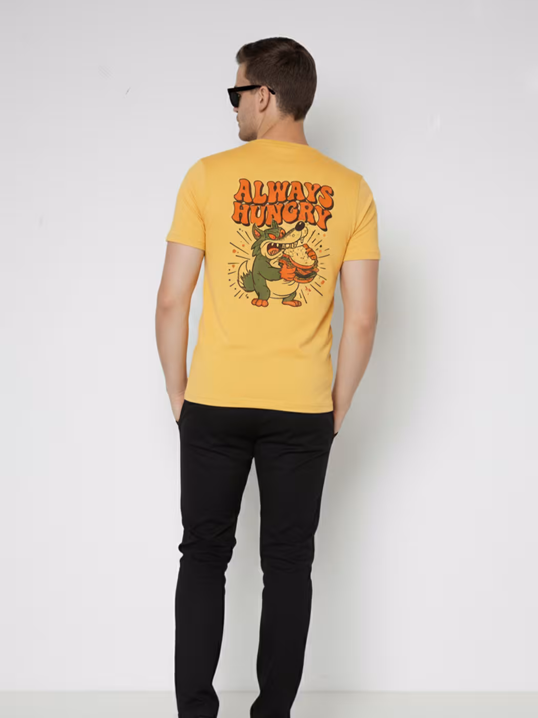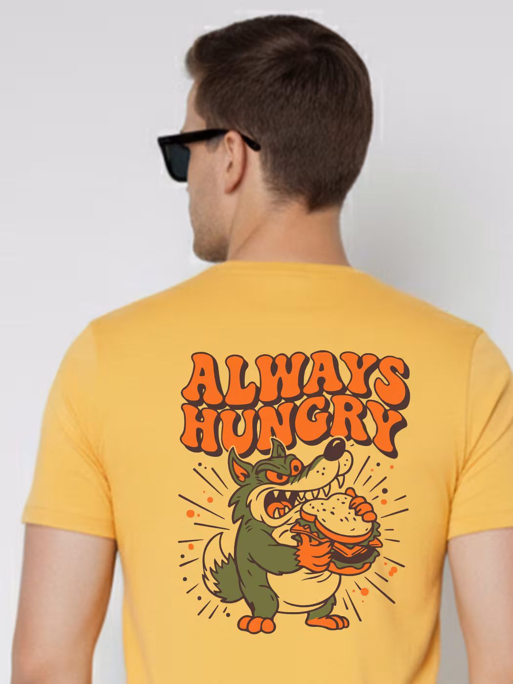 This back-printed Always Hungry tee combines minimal front design with bold graphics behind, offering streetwear flair with all-day comfort.