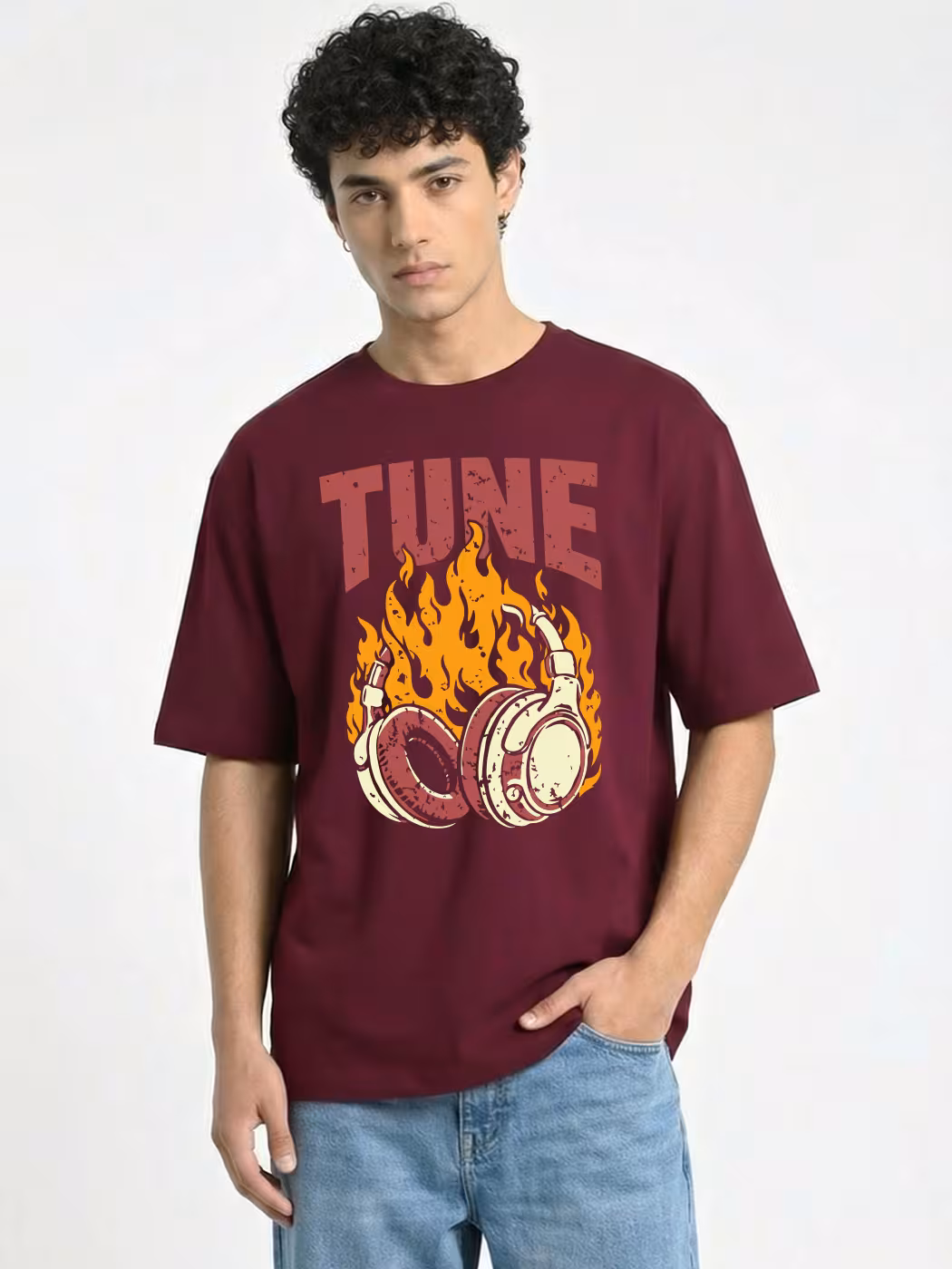 Oversized streetwear T-shirt with bold Blazing Beats design of Music. Made from soft, breathable fabric for relaxed comfort and an edgy urban style.