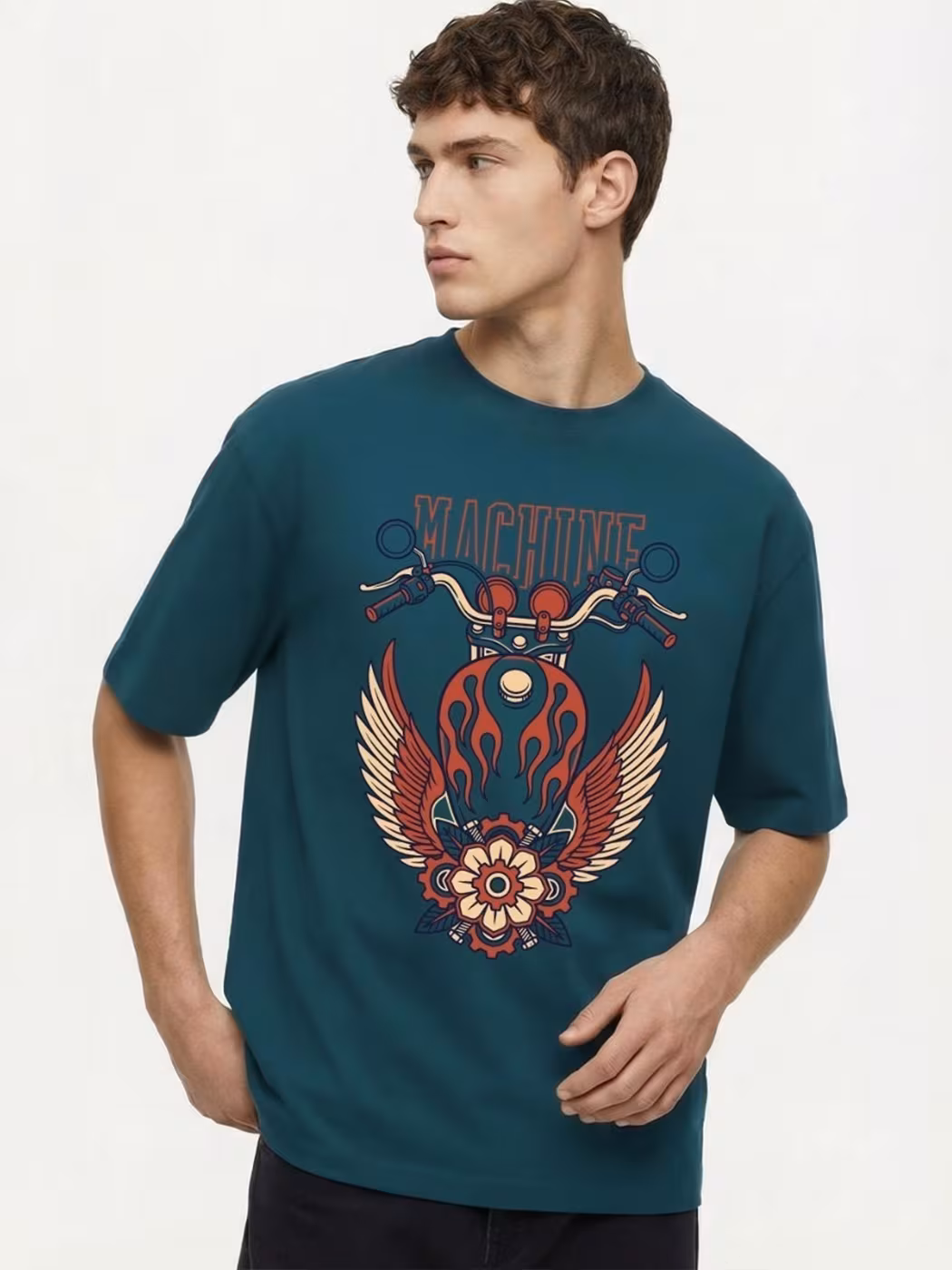 Streetwear oversized bike graphic T-shirt featuring Fly Machine design. Comfortable fabric with relaxed fit, perfect for urban and casual outfits.
