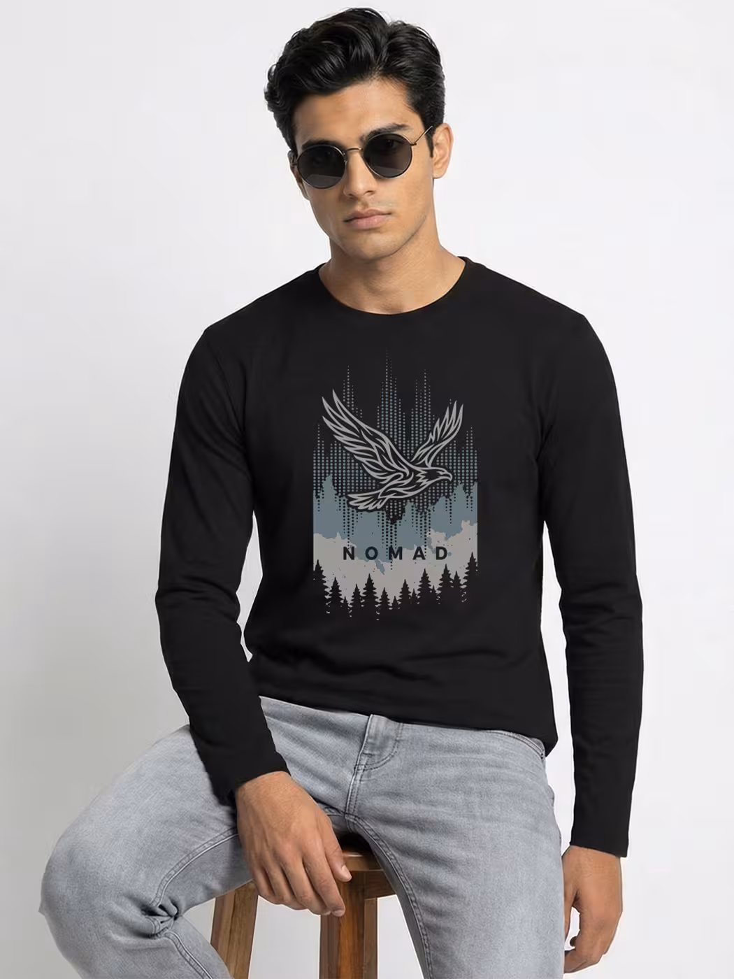 Men’s full sleeve Nomad graphic printed T-shirt designed for comfort and style. Soft fabric, regular fit, perfect for travel lovers and daily casual wear.
