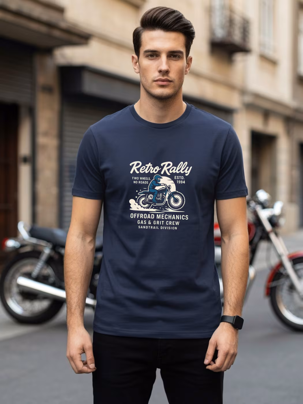 Retro Rally Printed T-Shirt for men with half sleeves. Perfect blend of comfort and casual style. Ideal for everyday wear, parties, or gifting.
