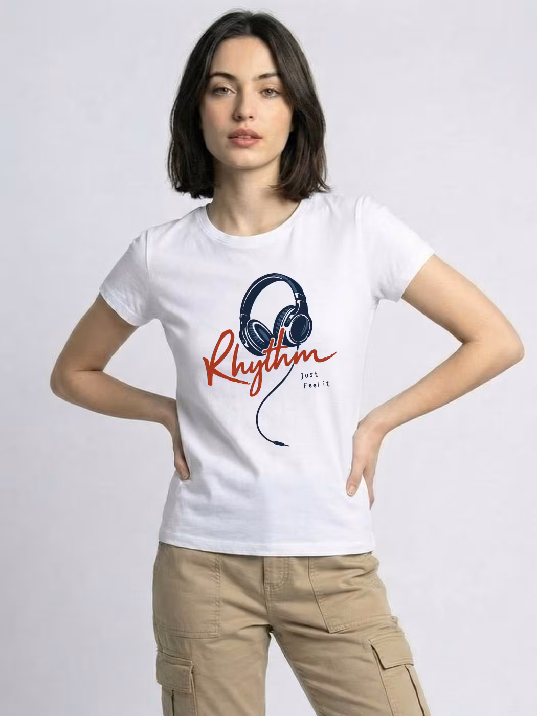 Women’s half sleeve Rhythm music graphic T-shirt crafted from soft fabric. Comfortable fit with trendy design, suitable for casual wear and everyday styling.