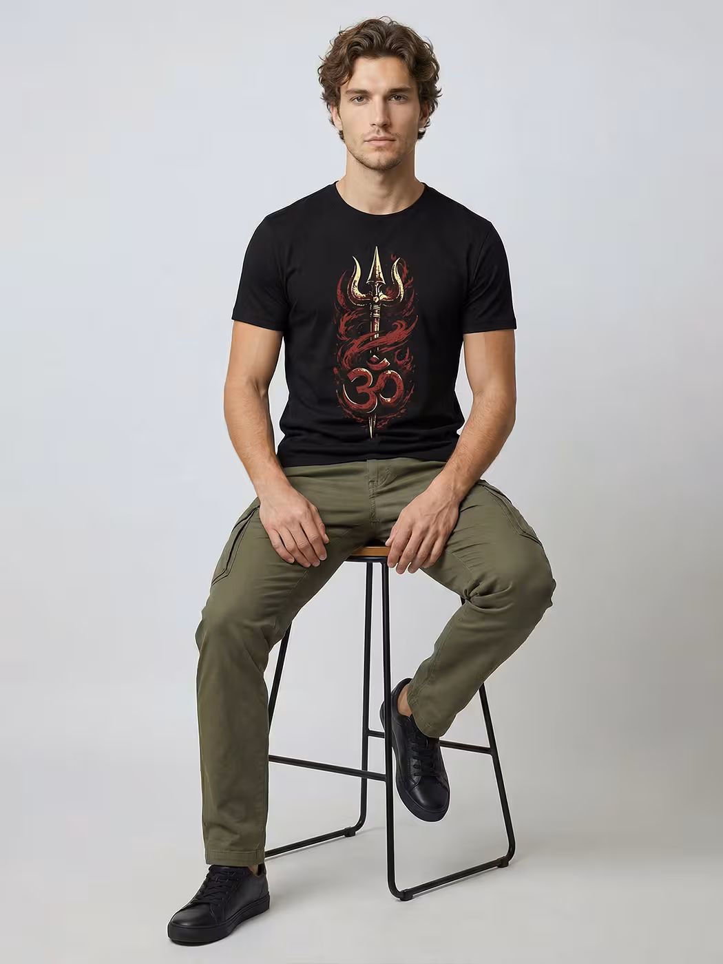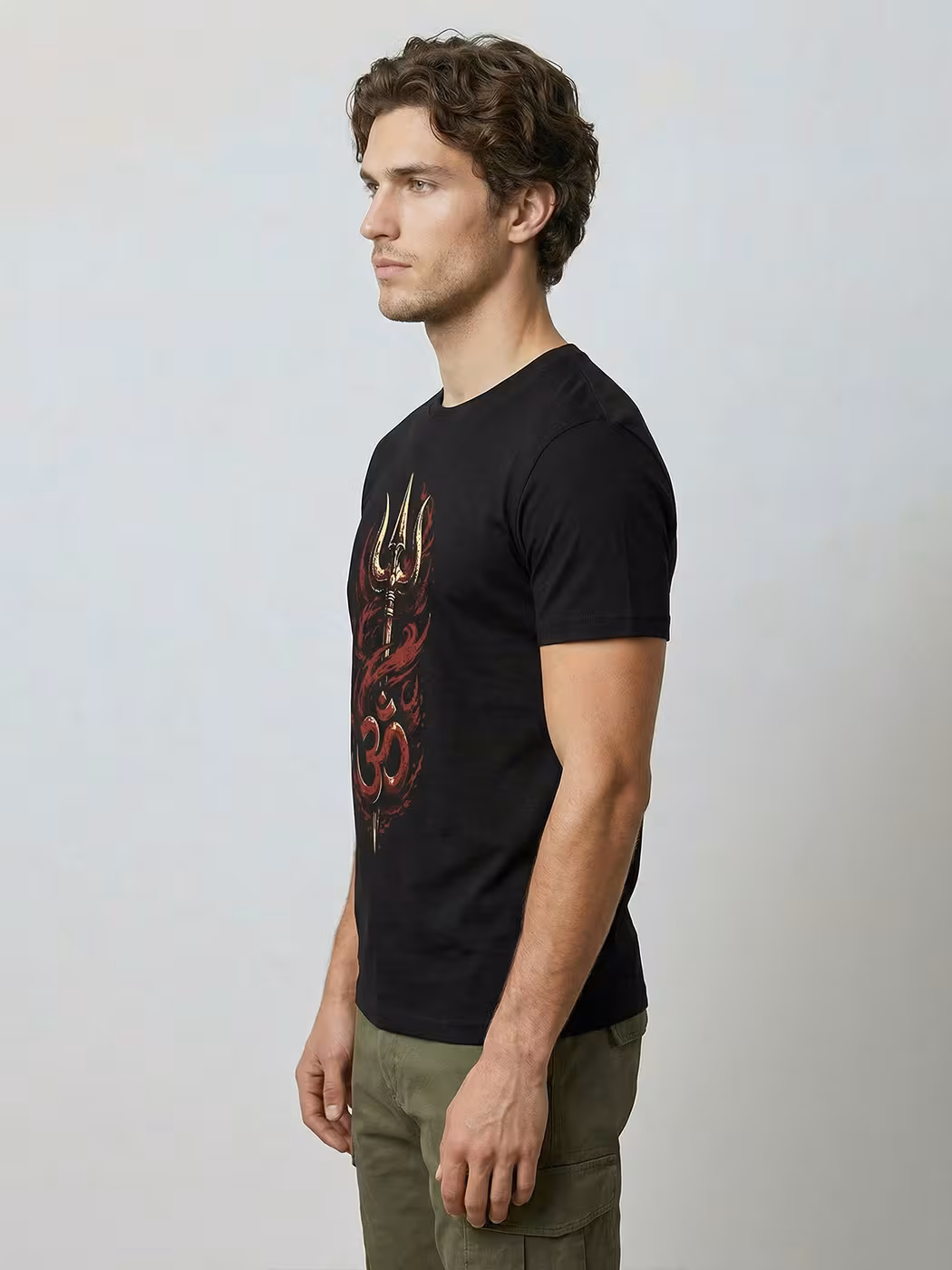 A powerful Rudra-themed men’s half-sleeve T-shirt featuring bold artwork symbolizing strength, spirituality, and confidence. Designed for comfort and daily wear with standout style.